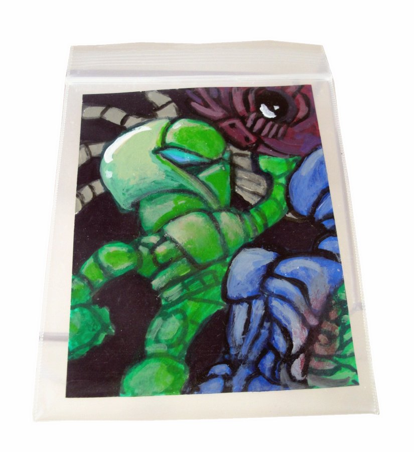 The toy also came with an extra head (shown above) as well as an original piece of art by Jesse Moore (shown below). Each individual piece arrived in its own ziplock bag and everything was well wrapped and protected in shipping. So will the MIB collectors demand that all three bags remain sealed, or will they only care about the main bag that includes the header card? Doesn’t matter to me; I opened all three bags.