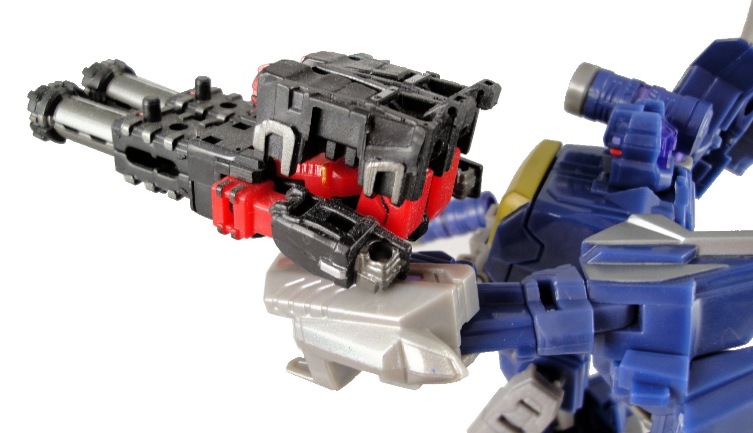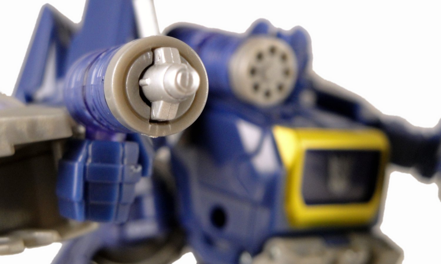 The original Soundwave’s weapons collapsed down and could be hidden inside the battery compartment, though the missile bits wouldn’t fit. In a nod to the past the new toy’s weapons both collapse down and snap into the cab; and this time every part can be concealed inside the toy since the barrel on the rifle slides down inside the body of the weapon. This is cool, but I’m hoping we see one of the third-party manufacturer’s bring us a transforming robot toy that folds down and slots inside this chest opening. A drone-like vehicle like we see in the War for Cybertron* video game would be perfect.