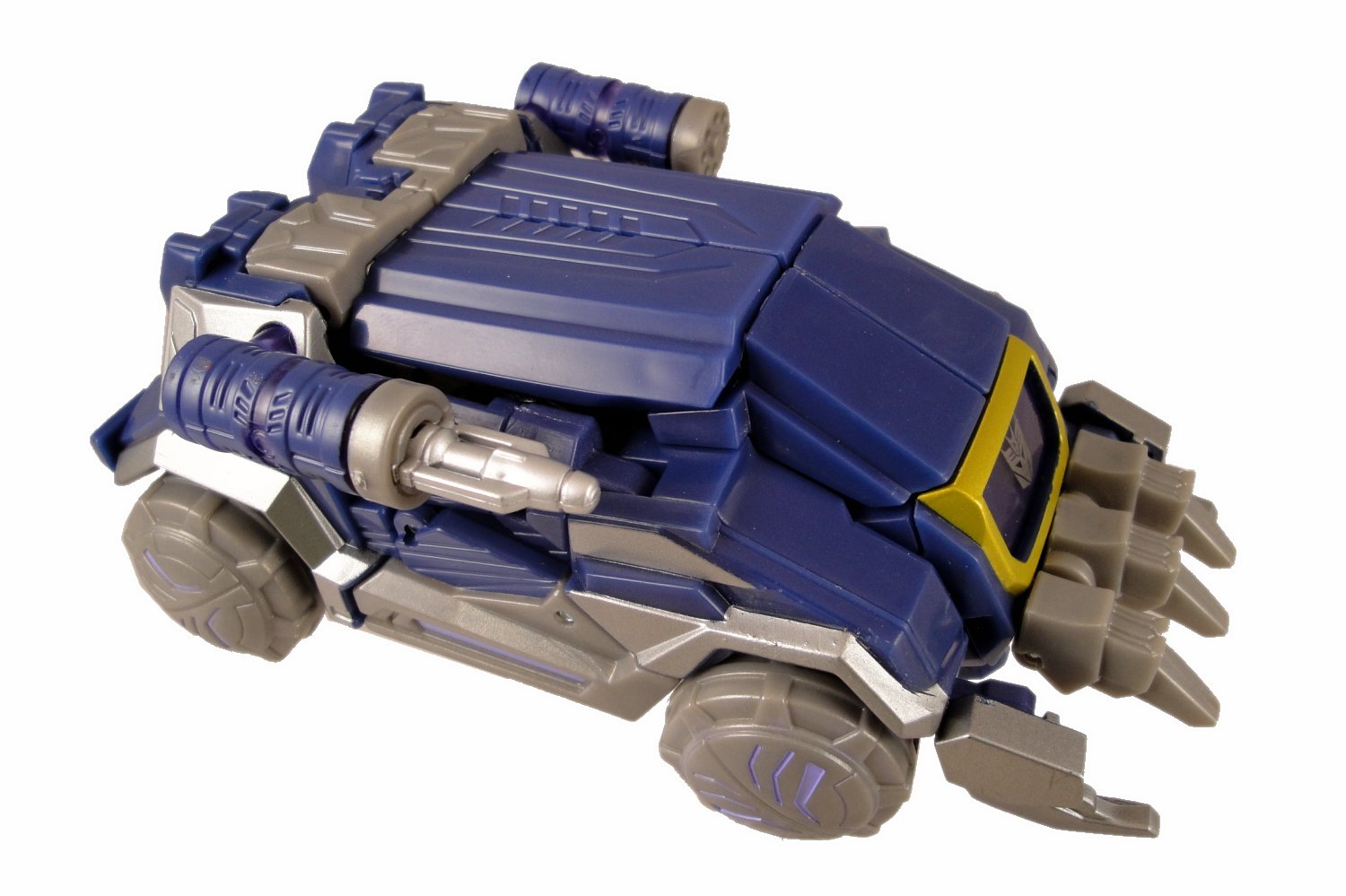 Starting with the weak mode first, Cyberonian Soundwave’s vehicle mode is some sort of armored car with weapons mounted on the sides. It’s a clever design that incorporates Soundwave’s classic chest design — originally his cassette player mode as seen in the 1984 release (Transformers Encore Edition Soundwave review here) — and gives us a decent vehicle that’s functional but not spectacular.