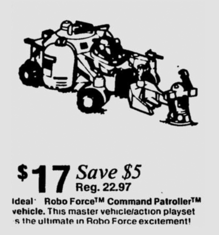 There’s a 1984 newspaper ad that I shared early in 2016 that is almost identical to this ad from December of 1984. Lots of little duplications between the two ads (including the Y-Wing and B-Wing ad block), but where things get fun is that this particular instance includes the Robo Force Command Patroller toy.