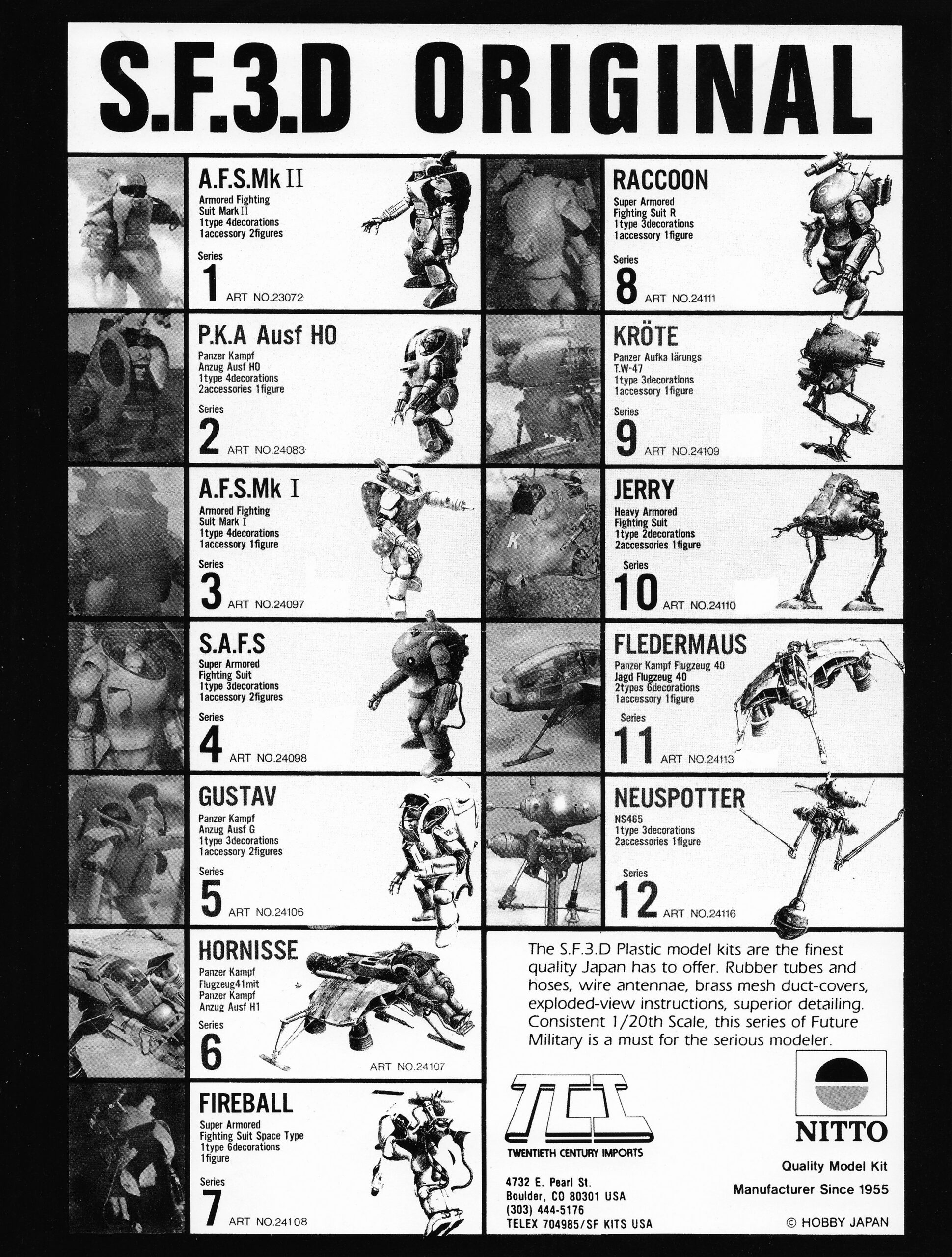 I found the S.F.3.D Original “Adventure Simulation Game†last fall and shared one of the marketing inserts in the box back in December (posted here). That pre-Maschinen Krieger insert wasn’t the only bit of promotion packed in the game box, though, so I popped the lid and grabbed this insert for the plastic model kits because you’ve gotta see just how many kits were available back when this was new. I’ve never been a huge modeler, but these robot kits look pretty damn awesome.