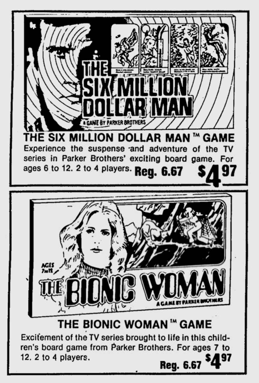 This 1977 newspaper ad for the Six Million Dollar Man and the Bionic Woman games from Parker Brothers exists to make our Friday just a little better. The ad quality is pretty good, even if those old prices make me again sad that I don’t own a time machine.