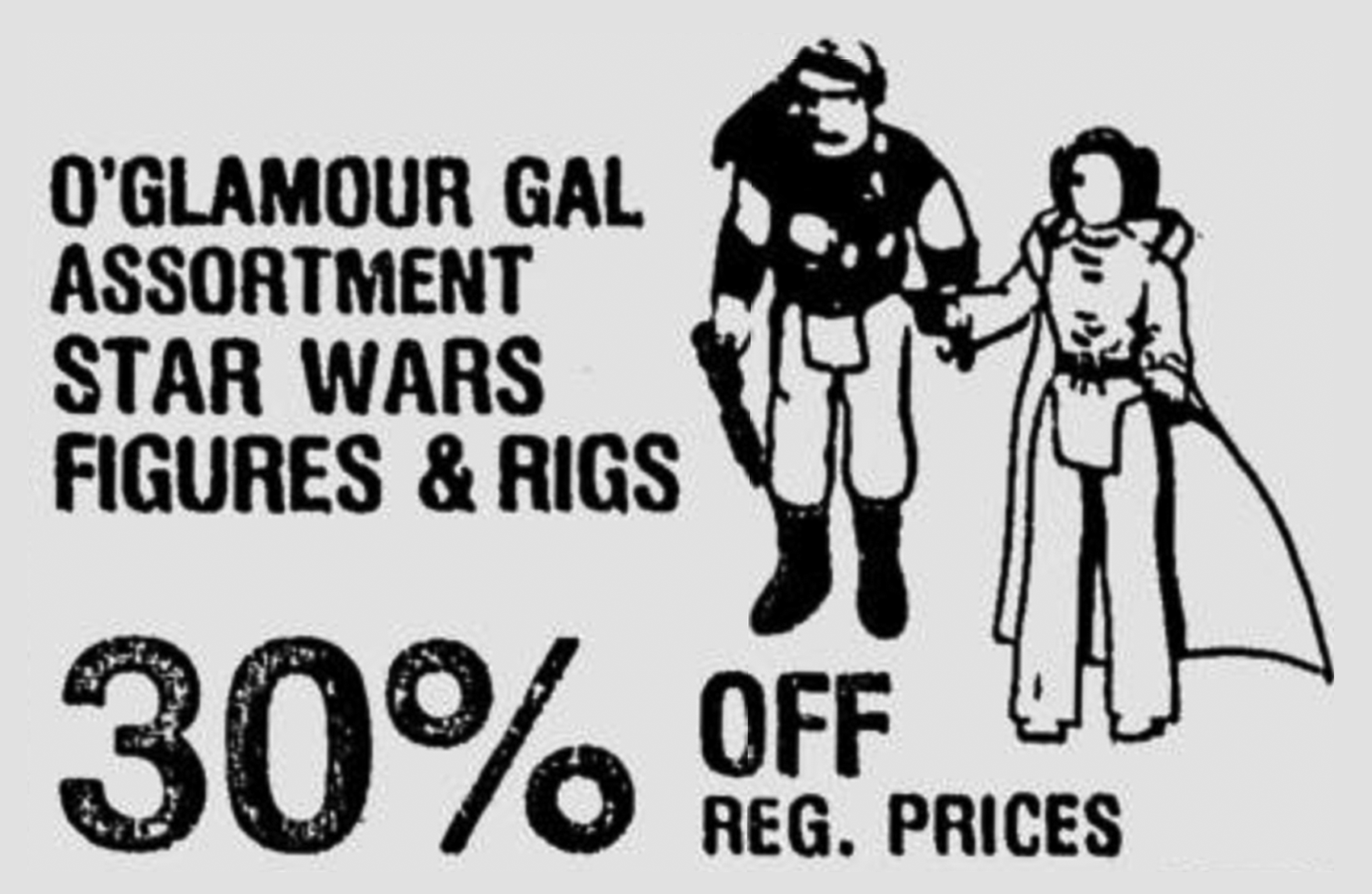 We know that Kenner sold tens of millions of Star Wars action figures back in the seventies and eighties, so it should come as no surprise that we keep uncovering newspaper ads for the toys. This 1982 ad offers up the toys for 30% off, but what I find most interesting about the toys is that we might have also uncovered another ad for the Mini-Rigs. There’s no pic, but what else can “& RIGS” mean in this ad block?