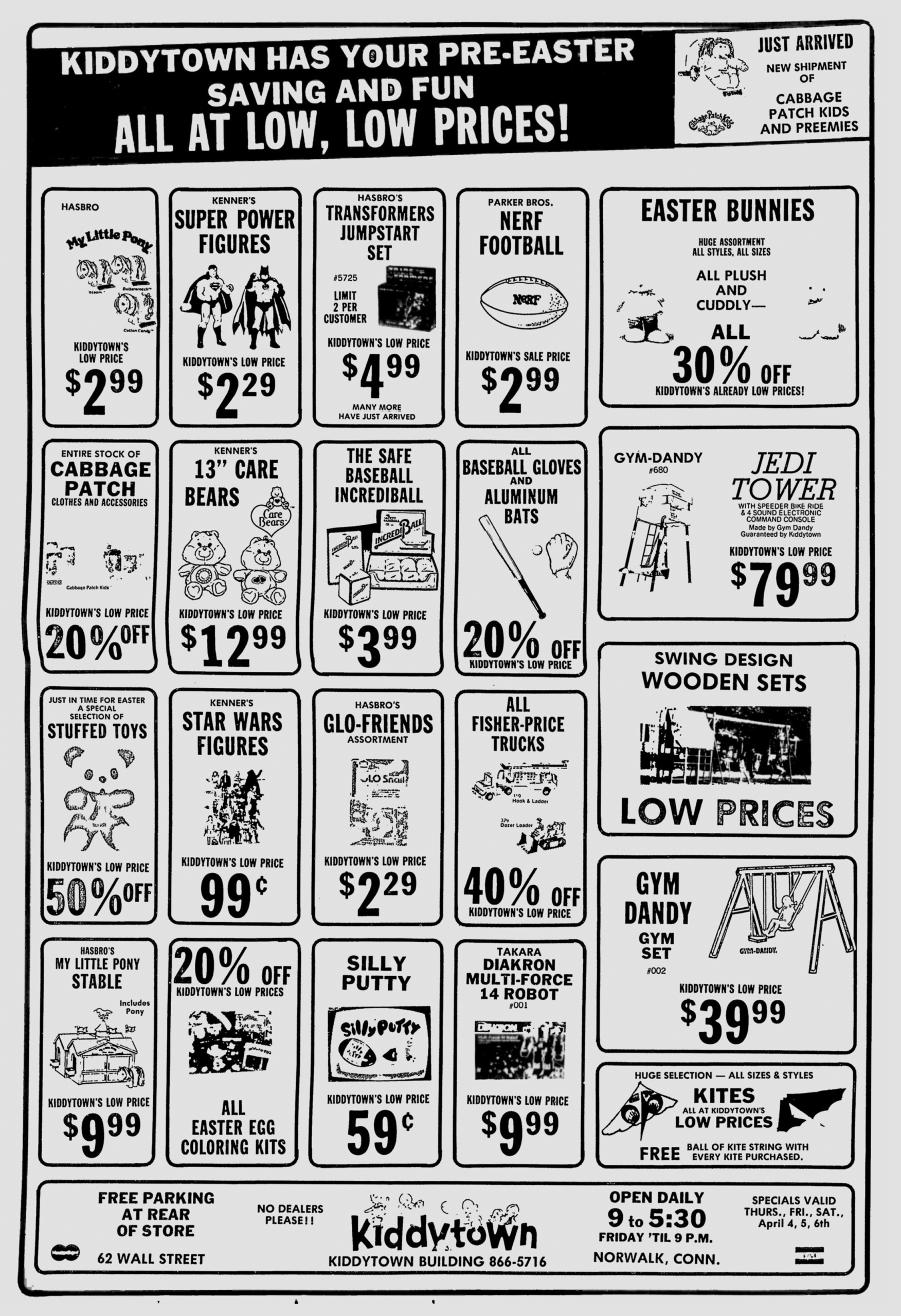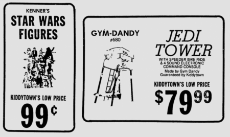 Hiding in this 1985 newspaper ad for Kiddytown is the Jedi Tower, a Star Wars-themed outdoor playset that is one of those massive pieces of Star Wars merchandise that many kids could only dream of back in the eighties. What surprises me most is that the playset is priced at only $80; I expected a much higher price tag!