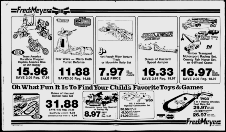 I wasn’t searching for Star Wars ads, but when one from 1982 — and for Kenner’s Star Wars Micro Collection — lands in my lap I’ll take it. This 1982 newspaper includes a Fred Meyer insert with a spread of toys, and standing out clearly and beautifully is this Kenner toy. Awesome.