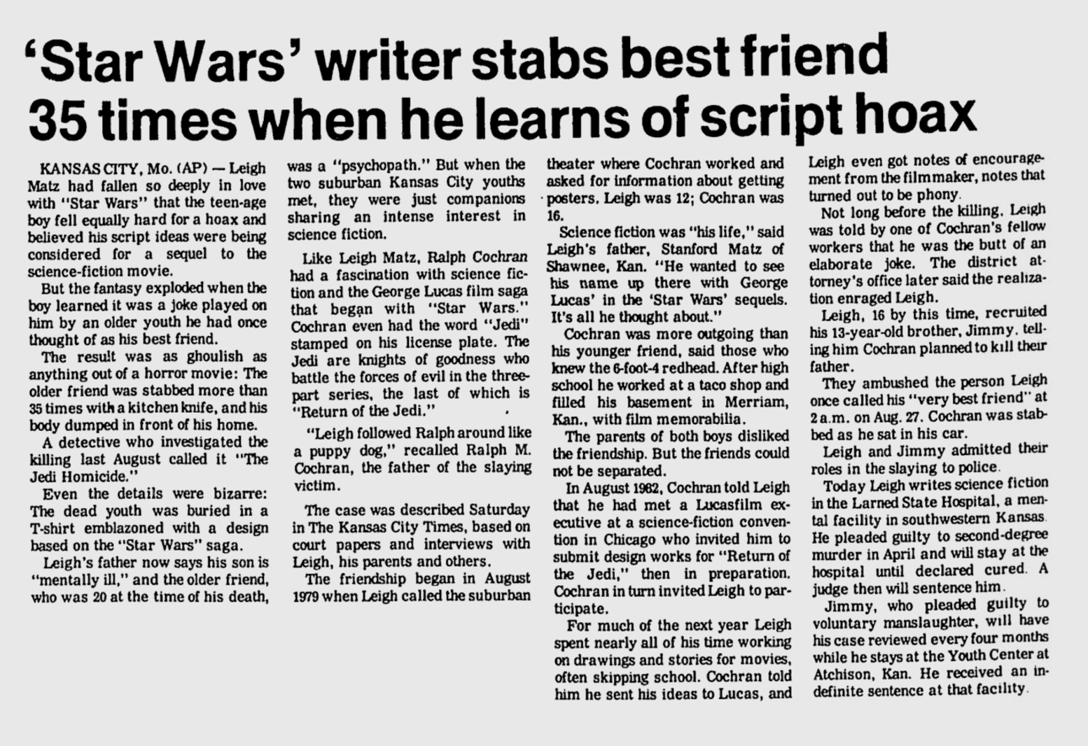 Here’s a horrible, twisted story from 1984 that really makes you stop and question the cruelty of children. From the Spencer, Iowa Daily Reporter newspaper comes this Associated Press article in which we learn the tale of Leigh Matz and Ralph Cochran, two Star Wars fans who found their way into the news for all of the wrong reasons. Matz murdered Cochran, and the grizzly tale is spelled out in this article for anyone who wishes to know more.
