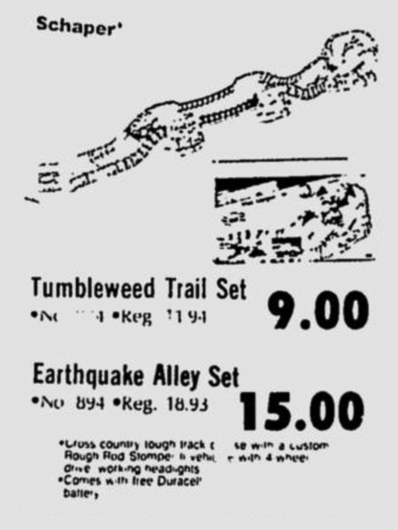 Here’s a 1984 newspaper ad for the fans of Schaper’s Stomper 4×4 motorized toys of the eighties. This Walmart ad lists the Tumbleweed Trail and Earthquake Alley terrain sets on sale, showing us what some of the more expensive Stomper toys of the eighties cost way back then. $15 in 1984? That was a lot of cash for twelve-year-old me, so it is no wonder I didn’t get all that into Stompers when I was a kid. That money was better spent on Transformers and G.I. Joe in 1984.