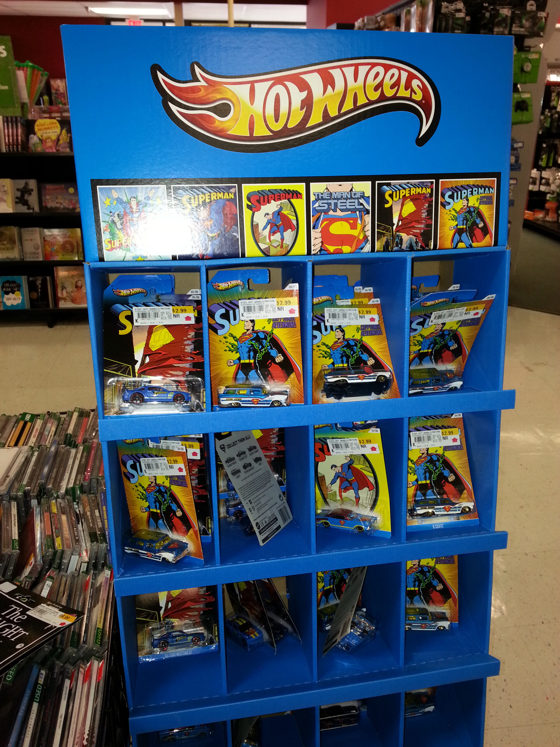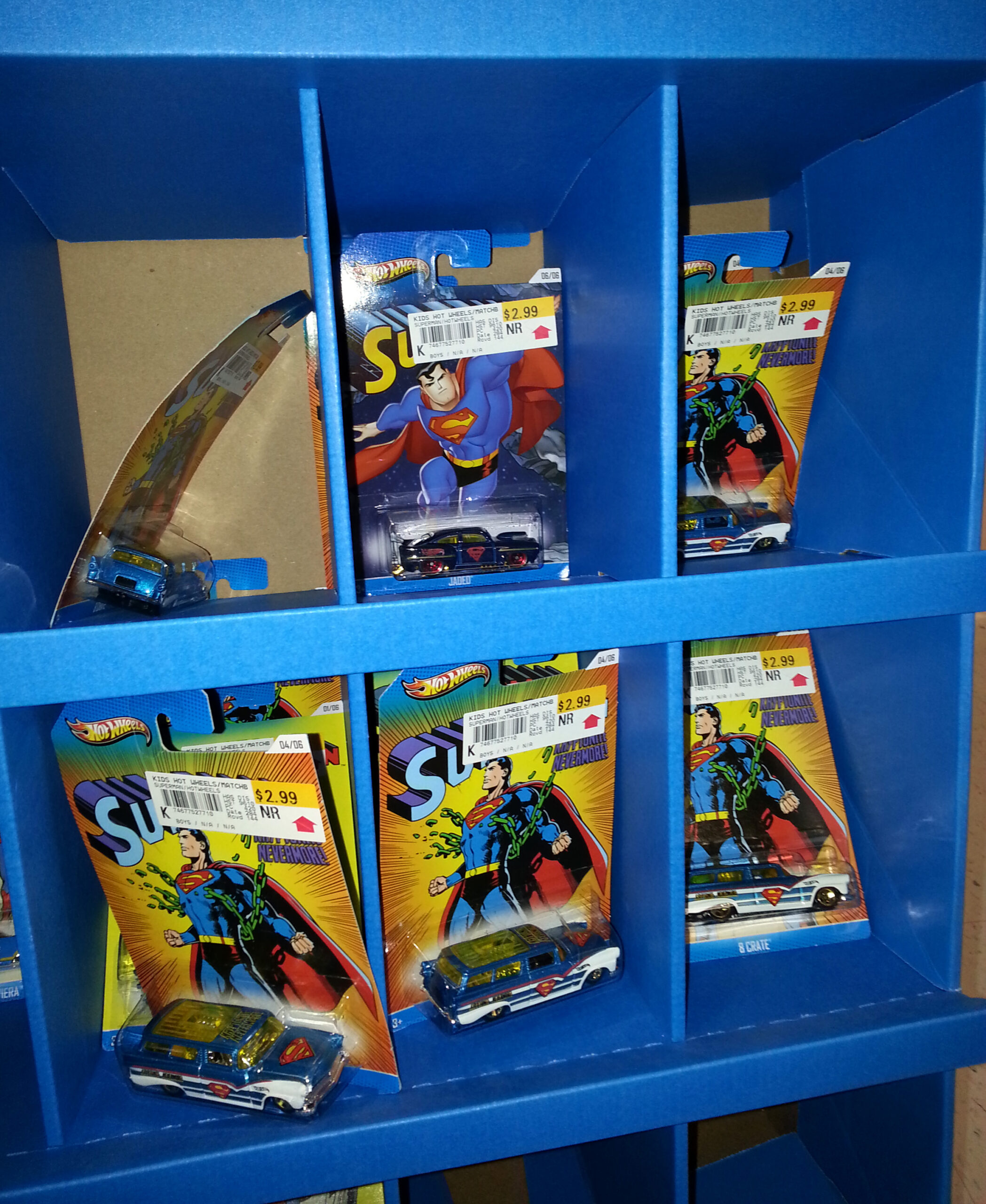The Superman Hot Wheels toy car series (Amazon.com search*) isn’t new, but I had not yet noticed this great display and just had to snap some pics when I was at Hastings. I love that Mattel keeps pushing out these designs and cannot wait to see what happens when they decide to widen the net and go after some indie comics.