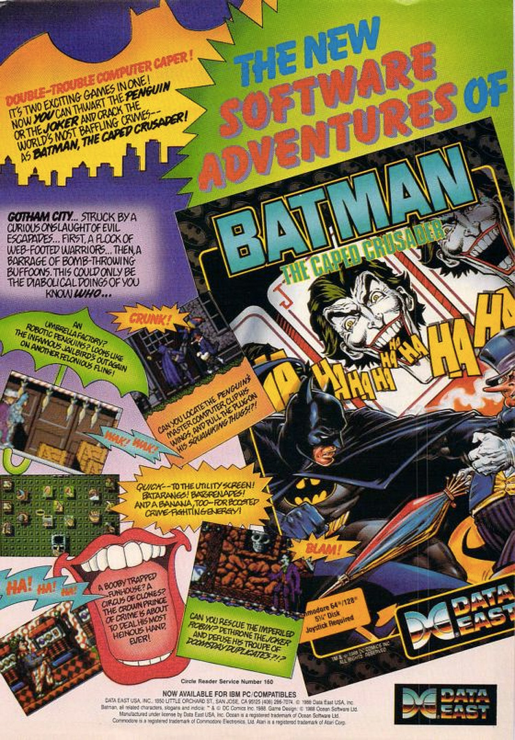 From a 1990 issue of Compute Magazine comes this ad for the Data East Batman video game of the day. I love how these old computer game ads show the actual gameplay screens small, devoting the largest chunk of space to artwork that you would never see in a game at that time.