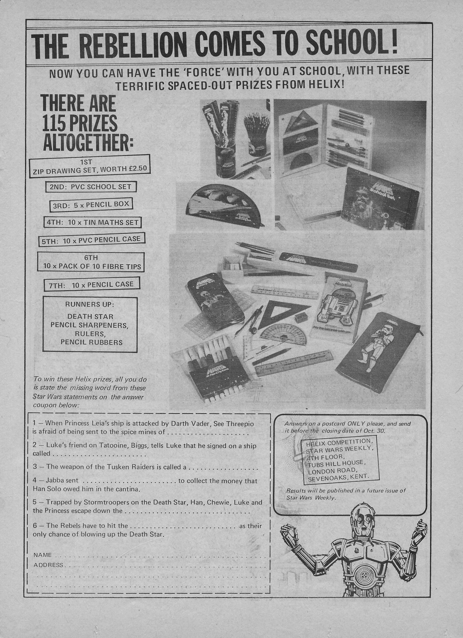 Pencil boxes, pencils, assorted school supplies. So much awesome stuff for the kids to take to school back in 1978 and me here all of the way in 2019 unable to enter the contest and try to win these prizes. Those UK Star Wars Weekly comics are packed with fun ads!