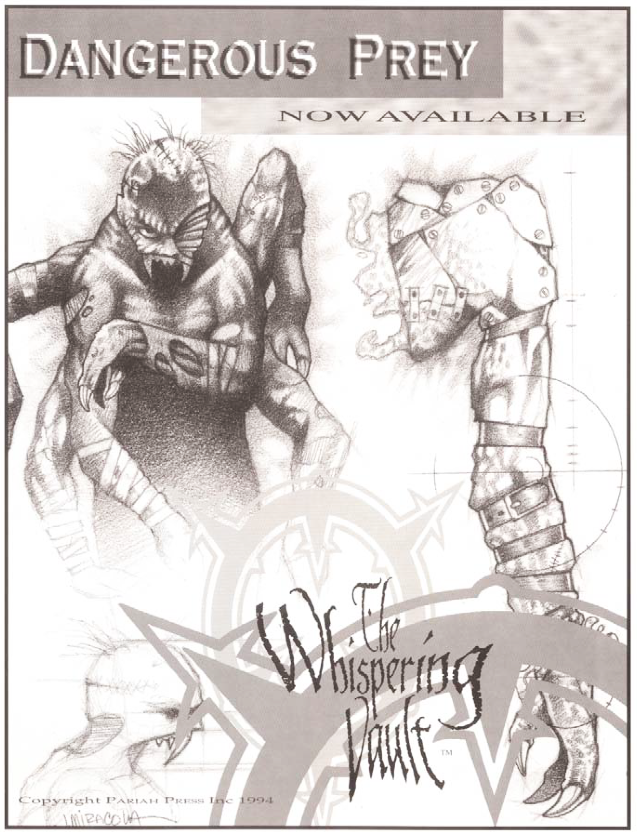 You may not know this, but I purchased the rights to the Whispering Vault* roleplaying game fifteen years ago, making this 1995 ad for the game’s Dangerous Prey supplement (found in a 1995 issue of Pyramid magazine) a bit of a personal treat. After all, how often do you get the chance to own a game line from the nineties and then encounter an ad for that same game in a magazine published by the company where you’re the current CEO? Yeah, this makes for a weird blend of parts of my life and leaves me thankful for how very lucky I have been all of these years.