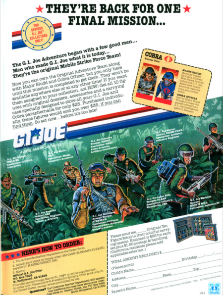 I included the G.I. Joe case in my Action Figure Carrying Cases book* last year, and today I’d like to direct your attention to the second issue of Hasbro’s G.I. Joe magazine and this full-page advertisement offering up both the case and ten G.I. Joe action figures. $25 for ten figures and the case is a fantastic deal, but what I most want to know is: