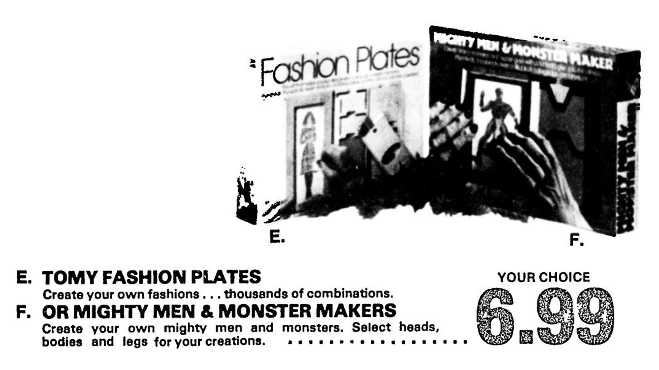 I posted two bits of fun for Tomy’s Mighty Men and Monster Maker this past weekend (1980 newspaper ad, TV commercial), and now we get to return to the Tomy art toy in this 1979 newspaper (jump to p. 78). What is best is that the similar set for girls, the Tomy Fashion Plates (find at Amazon.com*) also makes an appearance . . . and instantly reminds me how unfair it is to the kids of today that the Mighty Men and Monster Maker art kit isn’t available in stores.