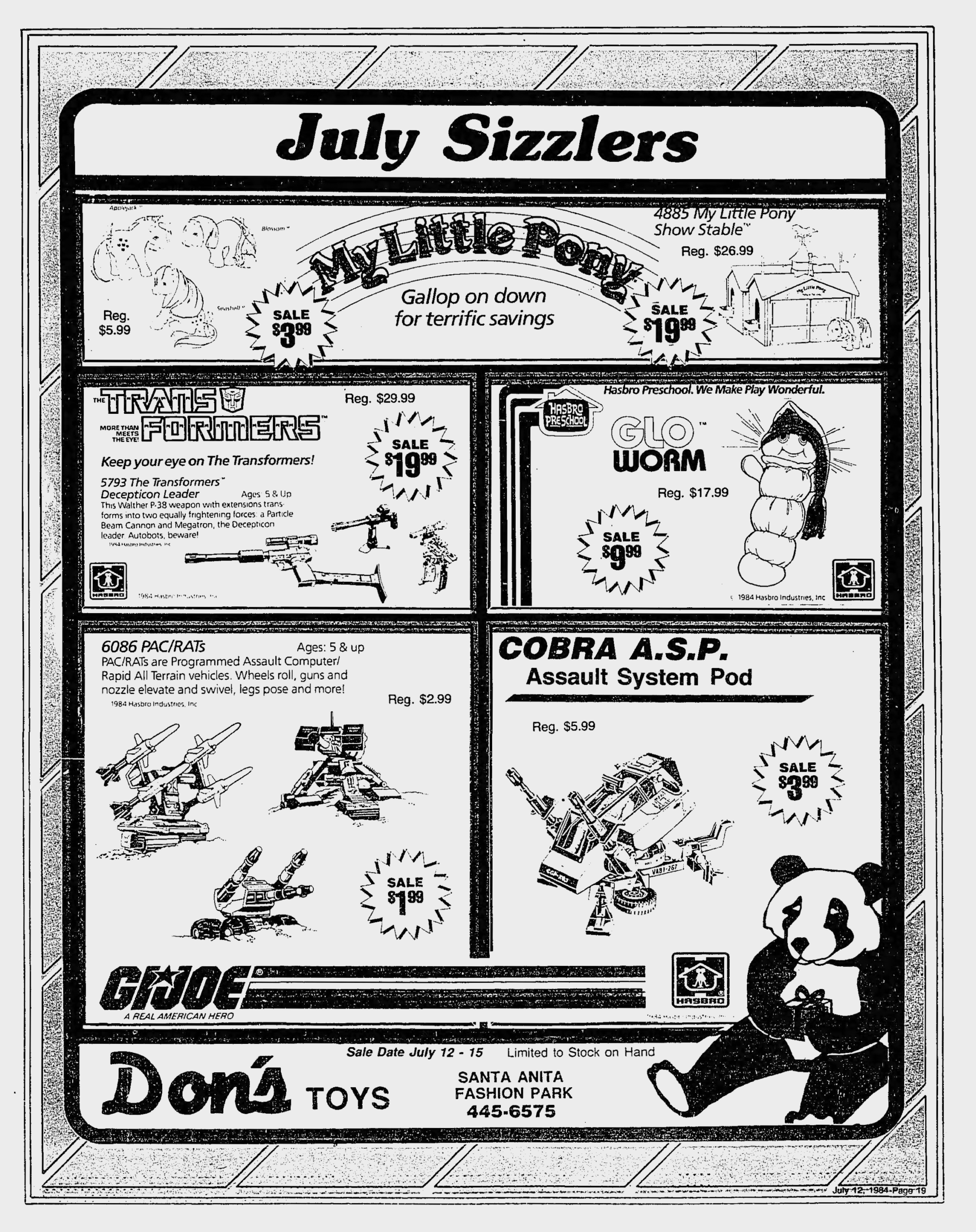 This July 12, 1984, newspaper advertisement for Don’s Toys from the Los Angeles Times is one of the earliest instances of Hasbro’s Transformers advertised in newspapers. Megatron instantly on sale for $10 off is a surprise, but I guess the store wanted to move some robot toys as fast as possible. Little did the store owners know that all they had to do was wait; within a few months of this ad running, the Transformers toys were the hot item of the season.