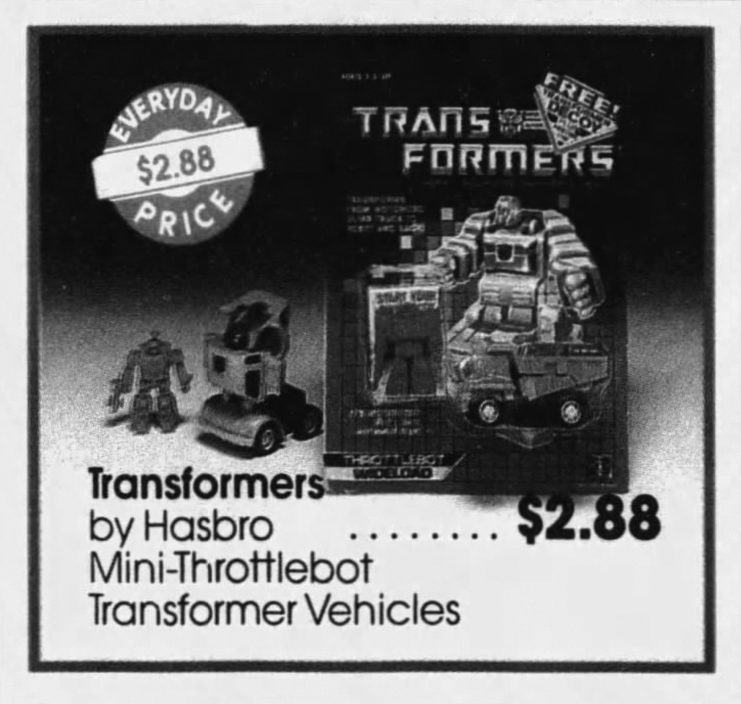 November 25, 1987. Featuring Goldbug and Wideload (review here), this 1987 newspaper ad from the Newport News, Virginia, Daily Press newspaper shows us the Transformers Throttlebots — with decoys! — on sale at the Phar-Mor stores. I happen to have pulled both of these toys from the shelves recently, but my small collection of decoys are still tucked away . . . I guess it’s time I dig those little guys out.