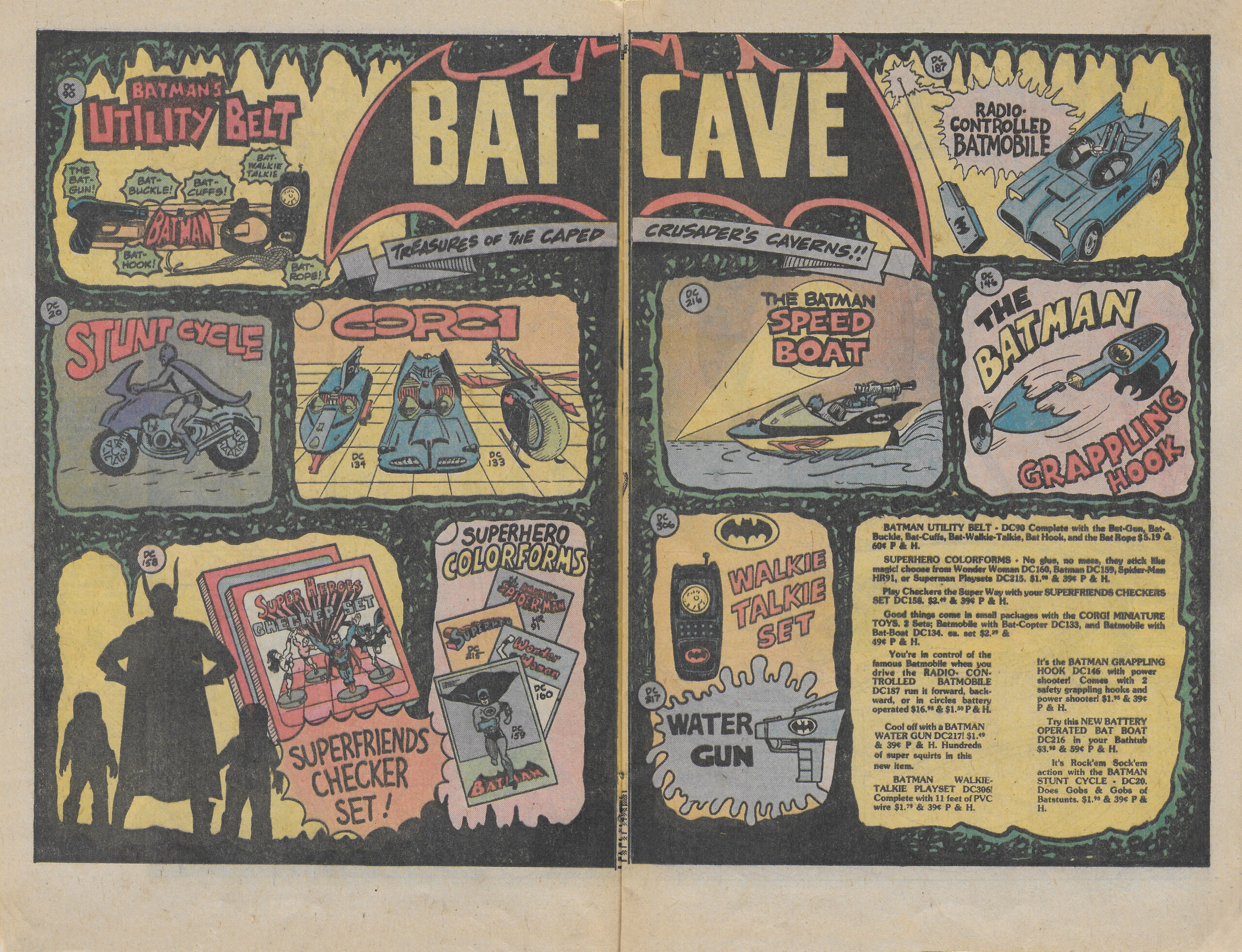 From 1978 and the Superhero Catalogue comes this two-page spread of awesome Batman toys and trinkets of the seventies. Out of all of the toys shown here, I remember having the Batman Colorforms when I was about five . . . and that’s all. I never had those amazing Corgi Batman vehicles, the utility belt, or the other unusual (and likely cheap) toys.