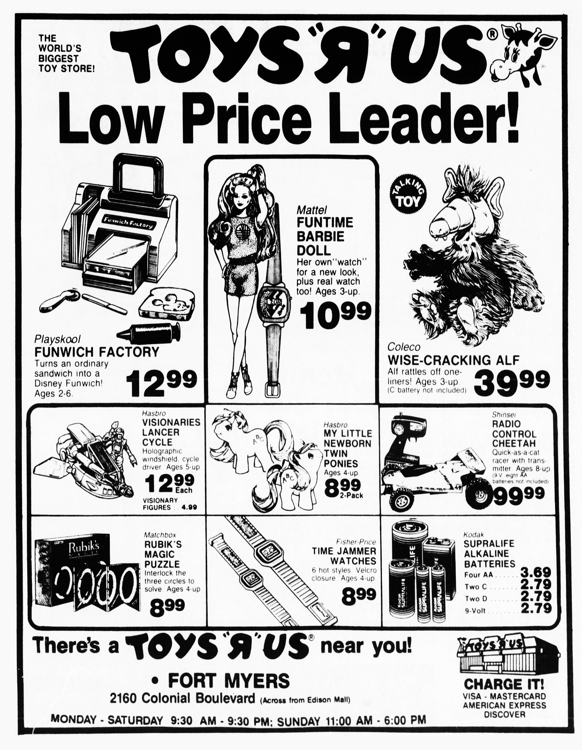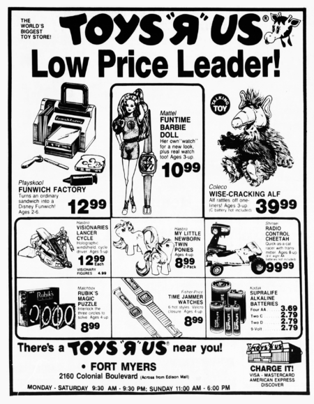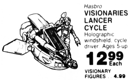 The Fort Meyers News-Press newspaper issue of September 10, 1987, brings us this look at Hasbro’s Visionaries, specifically the Lancer Cycle listed at $12.99 and action figures for $4.99/each. Visionaries was one of many action figure failures of the eighties, and seeing this ad reminds me that I really should have a selection of Visionaries toys in my collection here at home. How is it that I have zero classic Visionaries toys? That feels like a mistake.