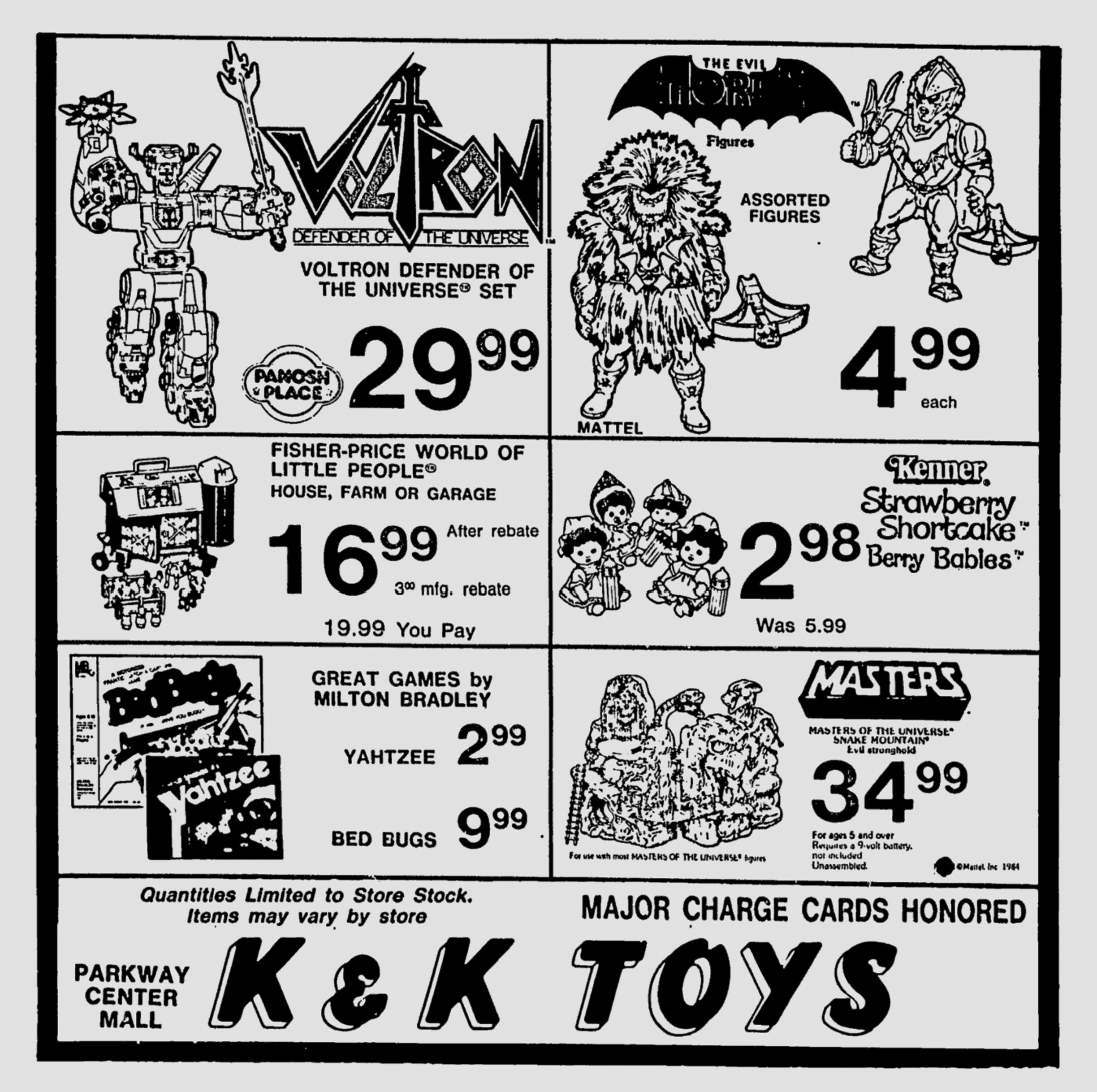 This 1985 newspaper advertisement features the Panosh Place Voltron lion pack at a price far lower than we have seen in some other newspaper advertisements from 1985. Voltron is one of those lines I haven’t collected, but I know many of you are fans, so I wanted to make sure to capture and share this for you to enjoy.
