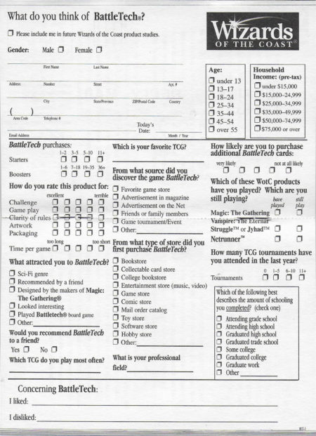 I mentioned the old Wizards of the Coast BattleTech trading card game a few days ago (posted here), and now that I have made it back from Gen Con, one of the first things I did was to grab the game rulebook and start reading through the rules again. There’s a limited and unlimited rulebook from the nineties, and out of the center of the limited rules (which is physically larger than the unlimited book) comes this reply card where Wizards of the Coasts asks: “What do you think of BattleTech?”